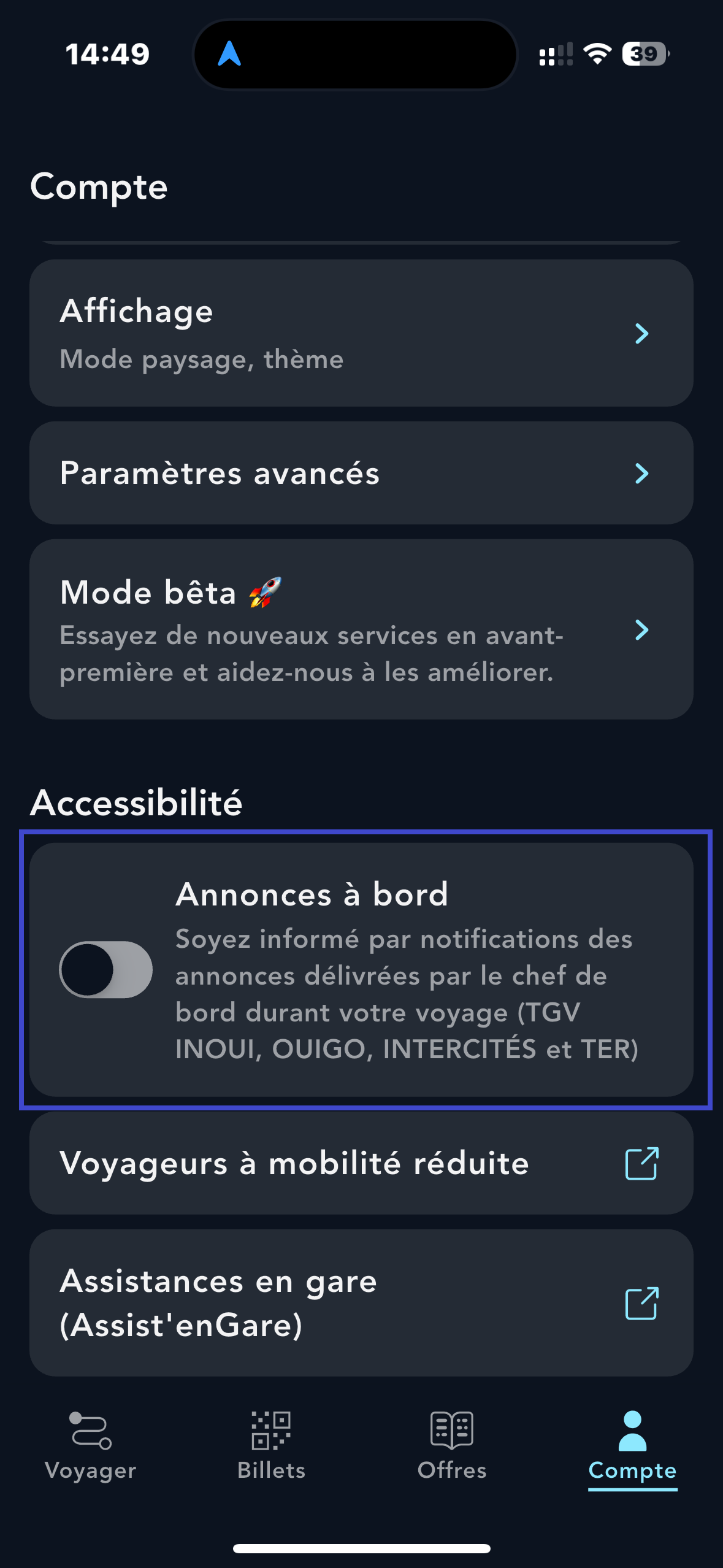 Pour ne plus être notifié des annonces à bord de votre train, il vous suffit de désactiver l’option depuis la rubrique « Compte ».