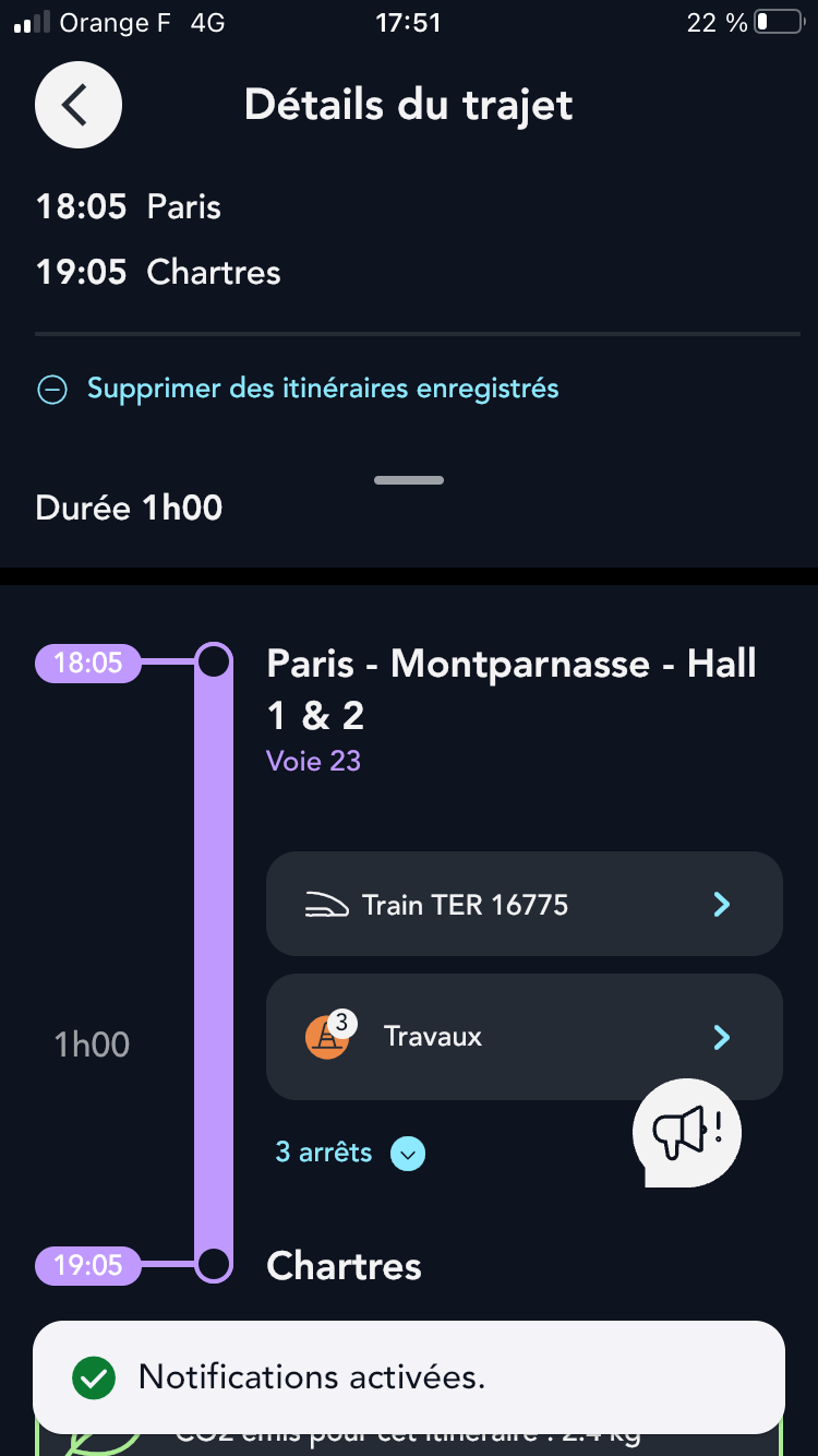Votre trajet est enregistré, vous serez informé sur votre train par notification.