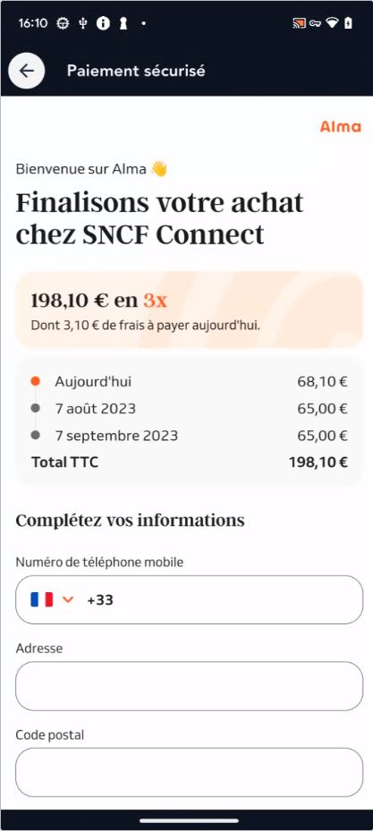 - A l'étape paiement, sélectionnez le paiement "en 3 ou 4 fois avec Alma", vous verrez les échéances et les conditions s'afficher.