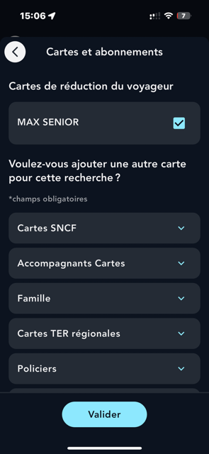 Sélectionnez la tranche d'âge (60 ans et plus) dans le menu Voyageur 1, puis indiquez votre âge et enfin l'abonnement correspondant MAX SENIOR