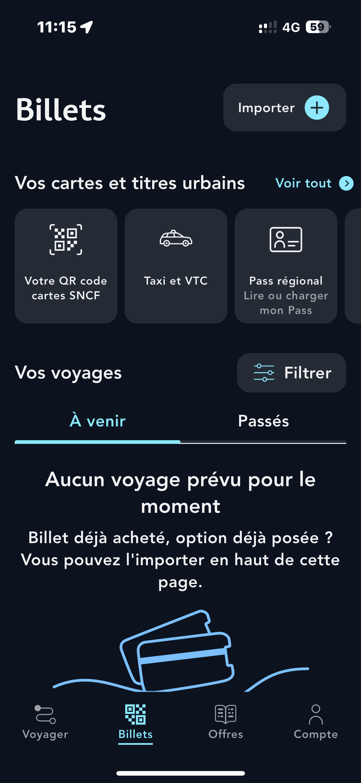 Vous pouvez réserver votre course ou consulter votre voyage à venir ou votre historique depuis l'onglet "Billets" de l'application mobile.